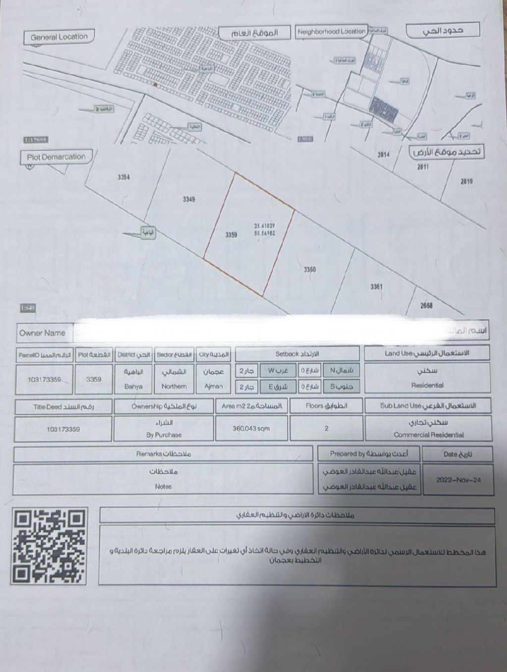 للبيع في منطقة الباهية عجمان قطعة أرض سكني تجاري G 2 شارع ظهر وبطن مساحة 360م - 3875 قدم تملك حر للتواصل