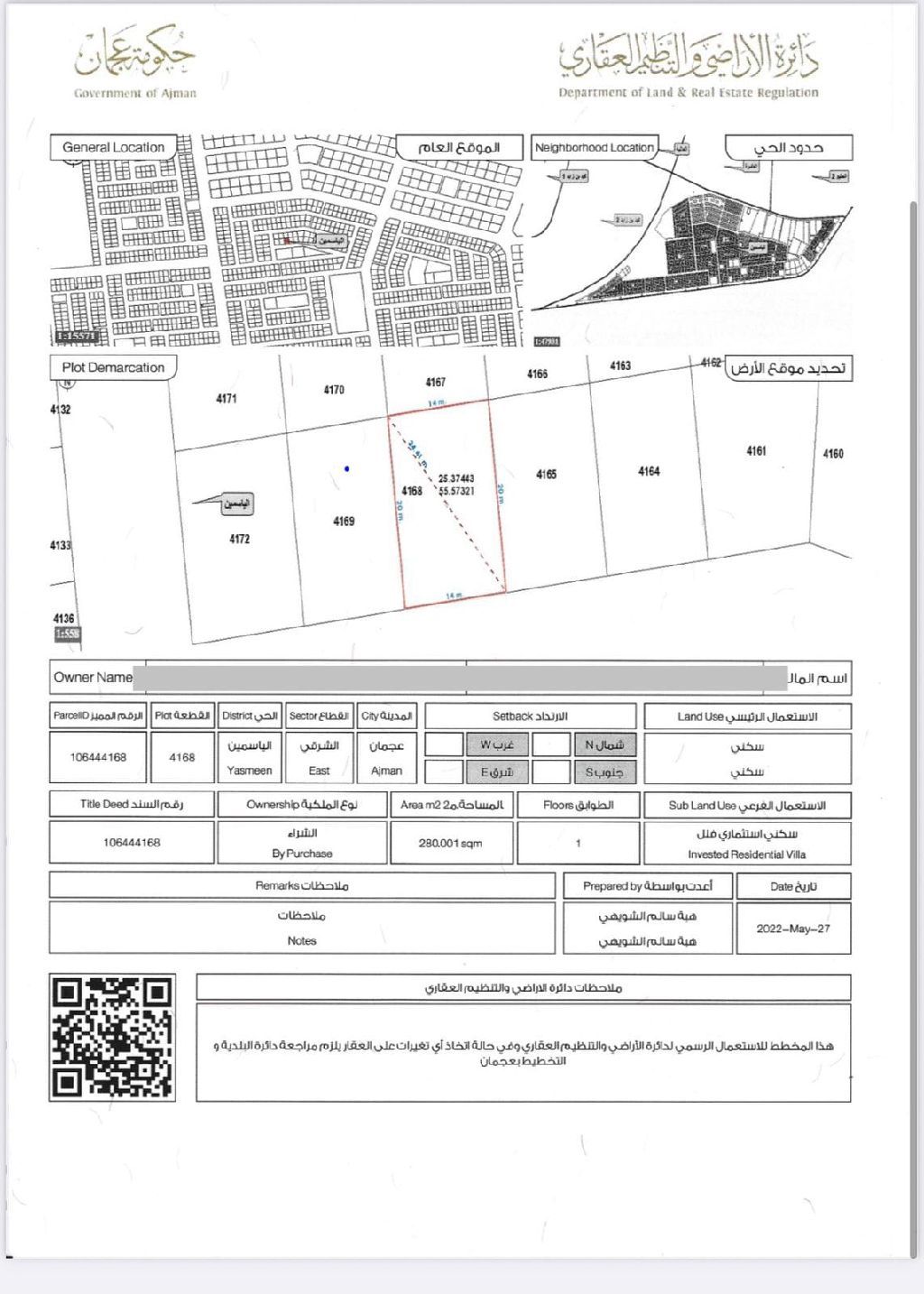 Al Yasmin, Ajman Two non - adjacent residential plots on a paved street. Permit G 2. Plot size 280 SQM. asking price AED740000 (excluding fees)