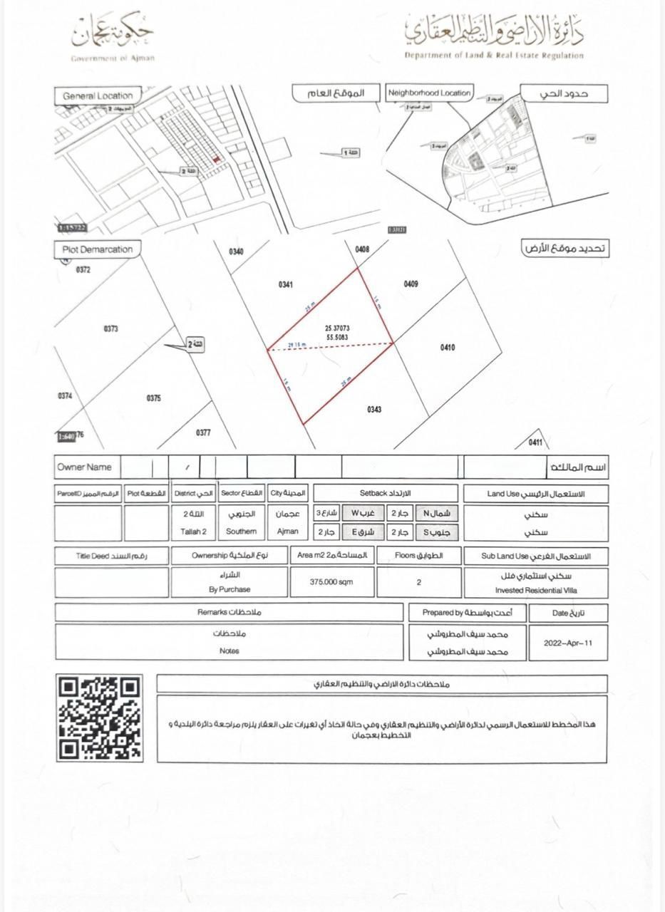 للبيع في التلة 2 في عجمان قطعتين سكنيات غير متجاورات شارع قار تصريح G 2 مساحة القطعة 375 متر للتواصل