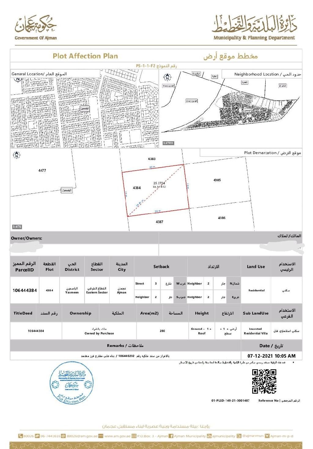 Land for sale in Al Yasmeen, residential, with an area of 280 SQM. Required 865 thousand dirhams, exempt from fees, including registration fees and developer fees