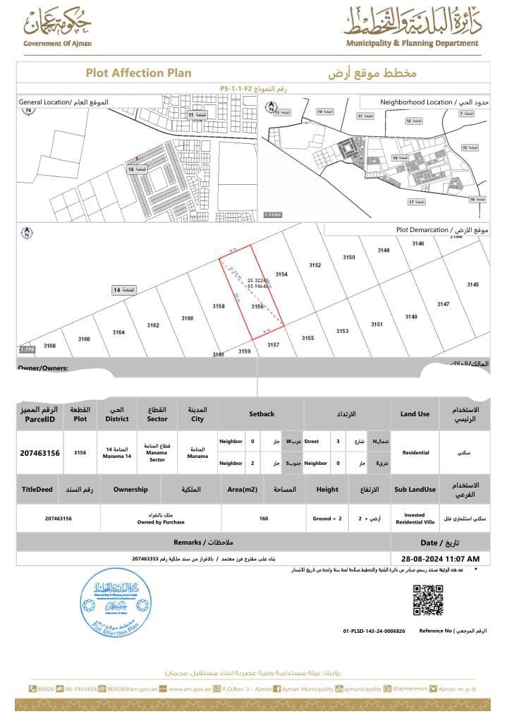 Quick Sale - Golden Plot of Land in Manama 14 Area 160 SQM 1722 SqFt Building Permit Ground + 2 Floors Use Residential/ Investment