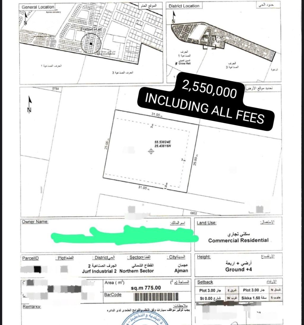 للبيع في الجرف الصناعية 2 سكني تجاري G 4 المساحة 775 متر/ 8342.03 قدم السعر 2550000 شامل رسوم التسجيل والنقل بالمطور