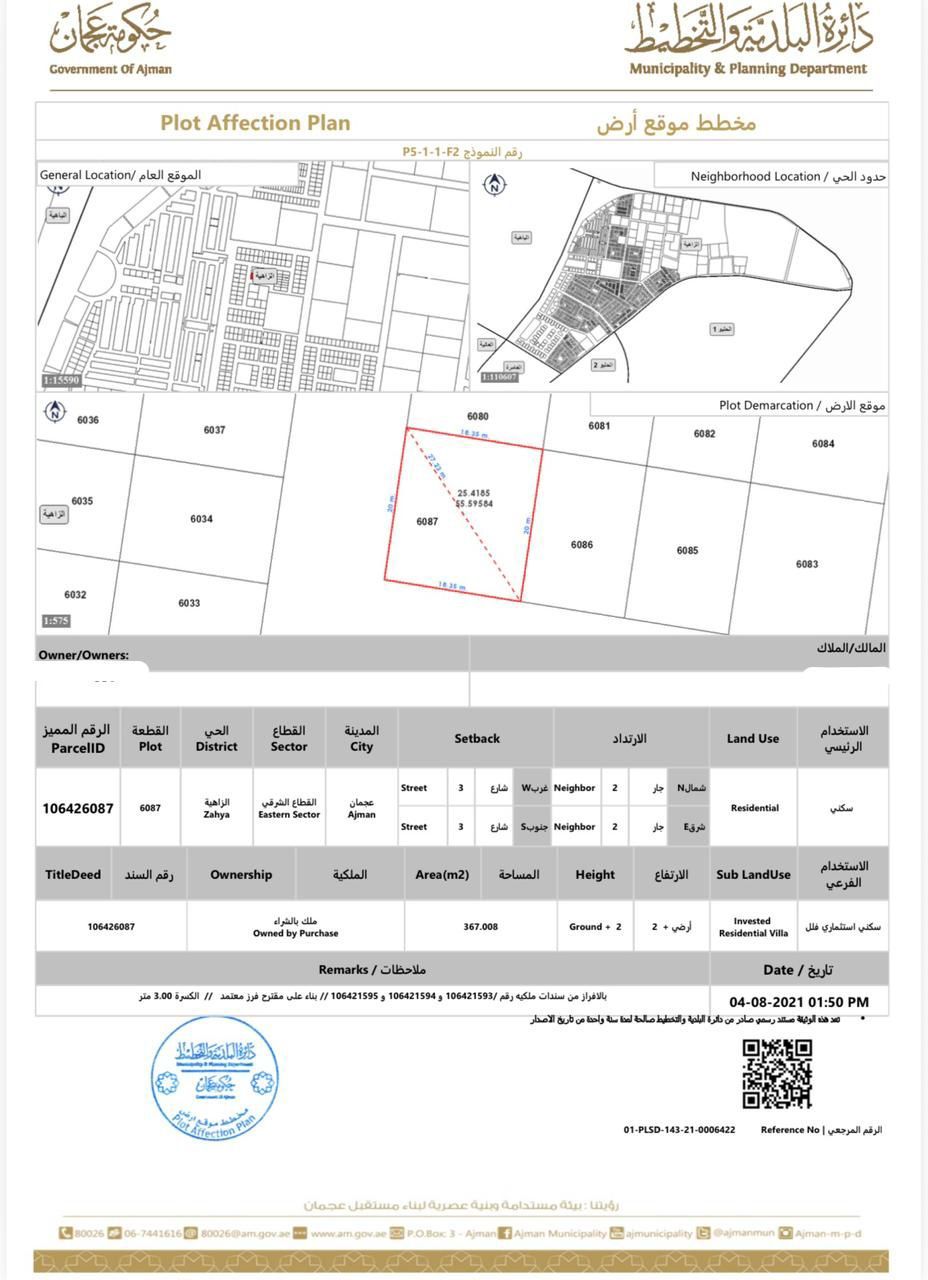 للبيع في منطقة الزاهية في عجمان قطعة أرض سكنيه زاوية شارعين تصريح G 2 تملك حر شارع قار مساحة 367م - 3950 قدم للتواصل
