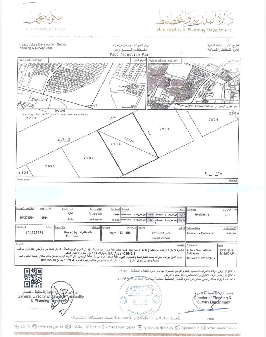 For sale In Ajman Global City, Al Aaliyah Residential/ Commercial Land Plot with Permit to Build a Tower (Ground Floor, 6 Parking Spaces, and 15 Floors) Two Streets (Back and Front) Freehold Area 1632 SQM (17566 SqFt) Construction and Unit Sales Possible asking price AED6500000 (Including Registration Fees)