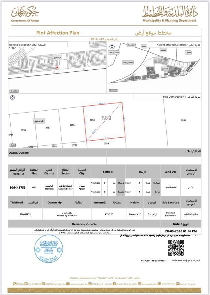For sale Residential investment corner land plot, 5000 SqFt, with permit for ground and two floors, in Ajman, Al Yasmeen area. Price 2 million AED. Freehold ownership available to all nationalities