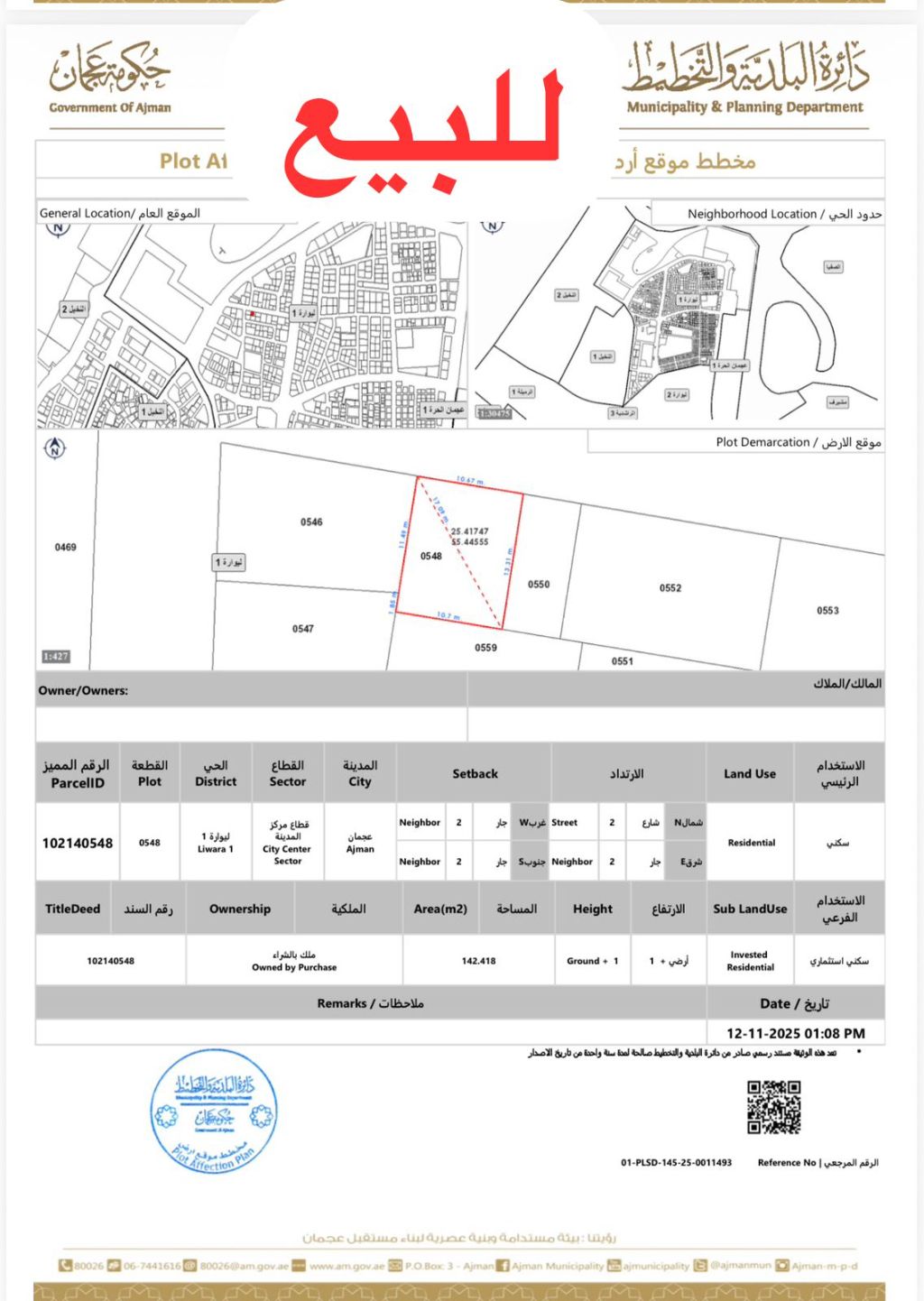 Liwara - Prime Opportunity for Investment & Residential Use for sale Two residential - investment plots ( G 2) in a highly strategic location near the Corniche and Ajman Museum. Plot 1 265m - Approximately 2852 SqFt Plot 2 142m - Approximately 1528 SqFt Features Strategic location close to all services Near Ajman Corniche and Ajman Museum Suitable for residential or investment purposes G 2