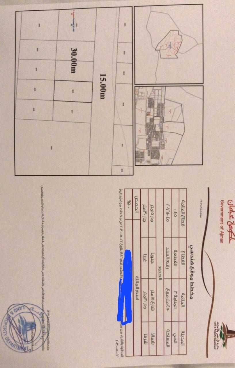 Residential land for sale in Manama, Basin 3, with an area of 450 SQM. The asking price is 180 thousand dirhams, not including registration fees