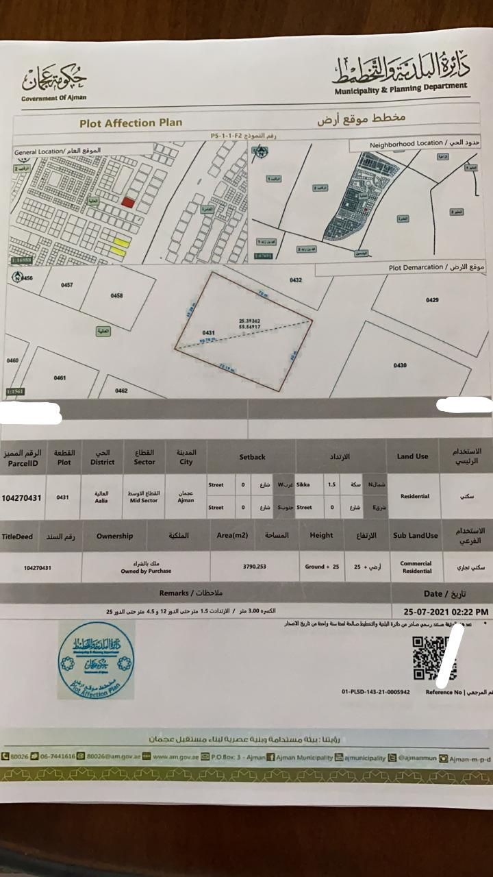 Land for sale in Al Alia, Ajman With a license to sell independent residential units Plot number (0431) Four side streets and a corner plot Corner plot With a license Ground floor + 25 floors Total plot area 40780 SqFt asking price AED35000000 Agency fees apply Submit your best offer If interested
