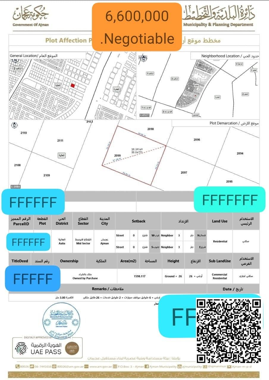 Corner Plot for sale - Al Aaliyah, Ajman (Residential/ Commercial) Prime Corner Location - A Rare Investment Opportunity Land Details Classification Residential/ Commercial Location Corner Plot Area 1599m (approximately 17103 ft) Permitted Height Ground + 26 Floors ( G 26) asking price AED6600000 Ideal for a residential or commercial tower project in a prime location Contact