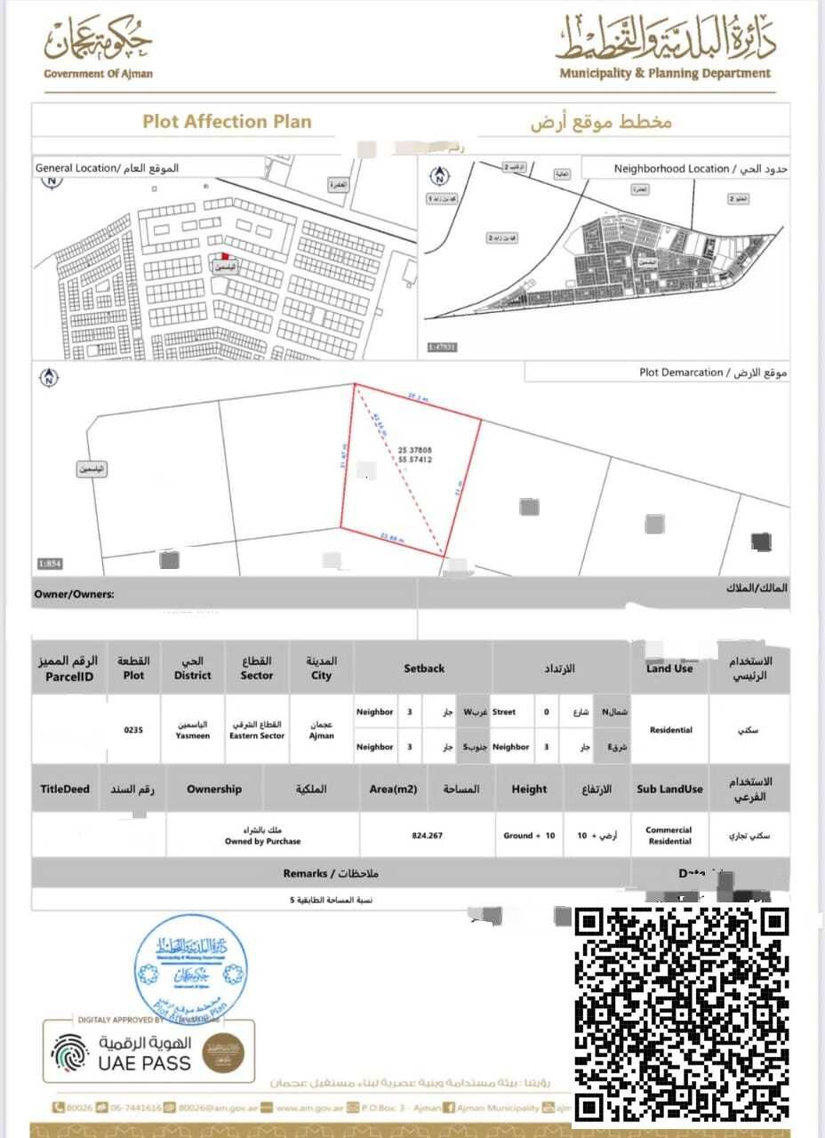 Prime Land for sale - Al Yasmin District, Ajman Rare Strategic Location Immediately Adjacent to Al Hamidiya Park Land Details Use Residential/ Commercial Area 8870 SqFt Approved Plan Ground + 10 Floors ( G 10) Ideal Location for a Successful Investment Project asking price AED3650000