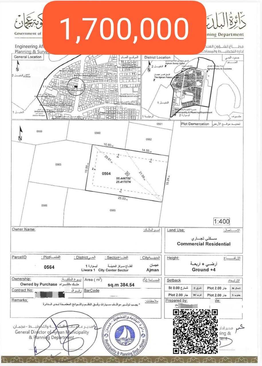 Residential/ Commercial Land for sale - Liwara 1, Ajman (Freehold for all nationalities) Excellent Strategic Location On a main two - way road leading directly to Ajman Port and the city center. Adjacent to a mosque - an ideal location for convenience and proximity to services. Land Details Permit Ground + 4 floors ( G 4) Area 4140 SqFt Suitable for building a multi - story residential/ commercial