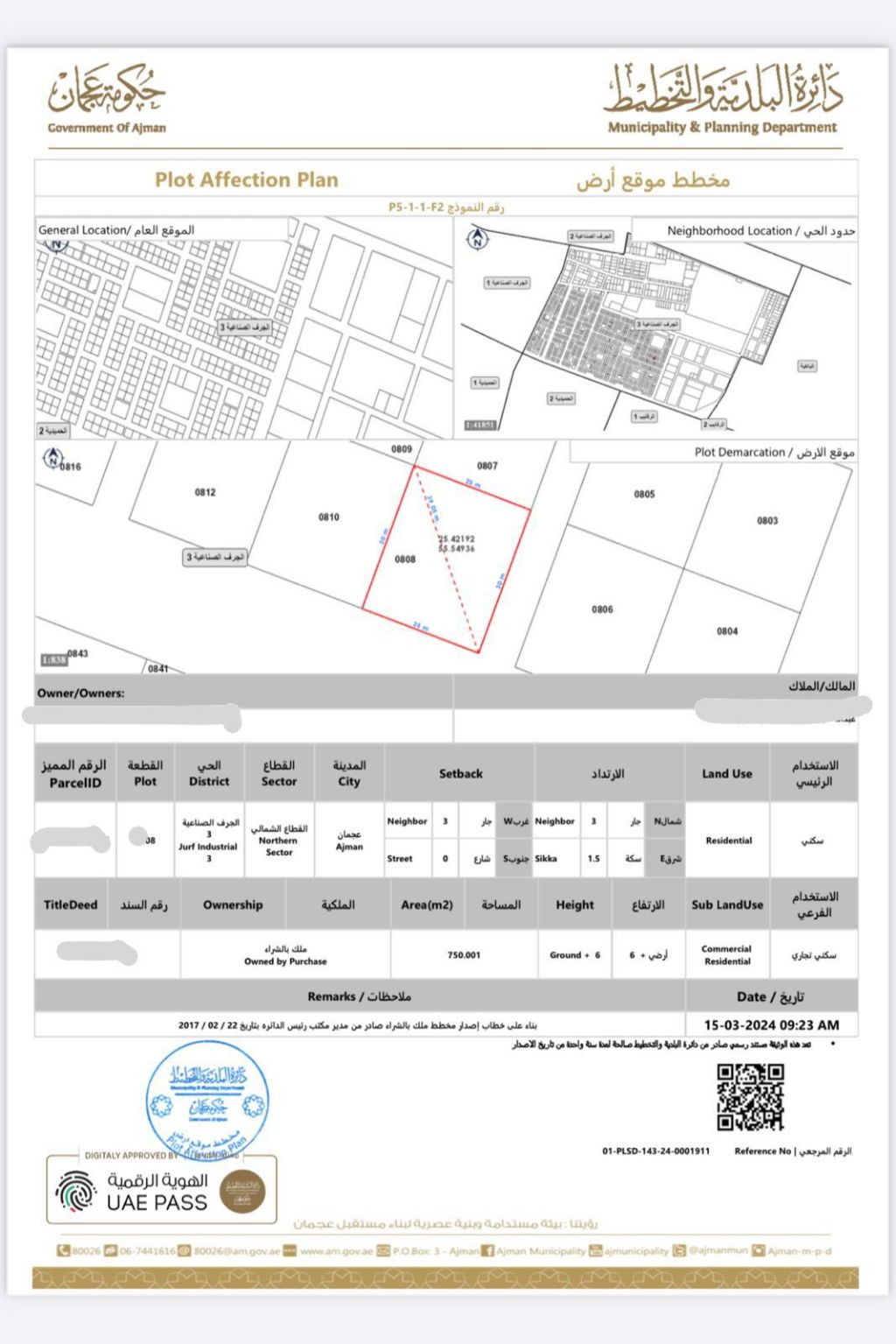 For sale in Taljerf 3, Ajman Residential/ commercial land with permit for ground floor + 6 floors. Located on a street and alley. Area 8025 SqFt. The land has a building permit, engineering plans, and is paved with cement. asking price AED2600000