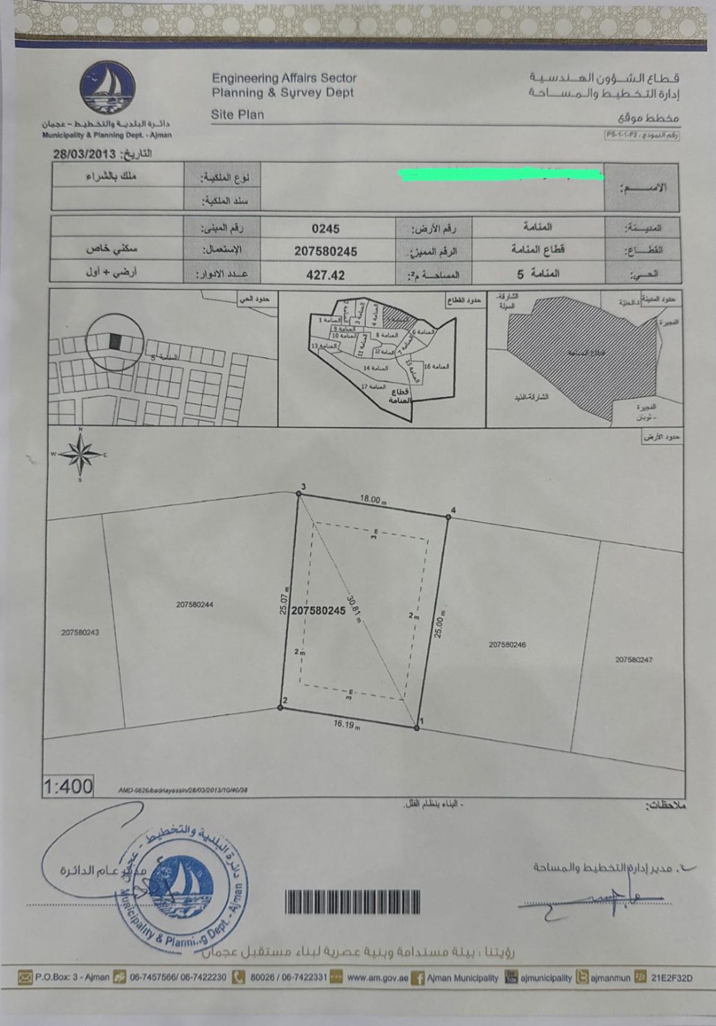 Land for sale - Al Manama Ajman Good opportunity to own land in Al Manama, Ajman, at a competitive price, suitable for residential or investment purposes. Land Details Location Al Manama - Ajman Area 427 SQM asking price AED170000