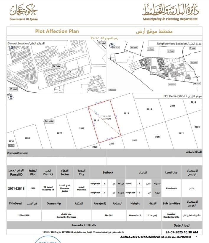 Land for sale - Al Manama Basin 14 Good opportunity to own a land plot in Al Manama Basin 14, suitable for residential construction or investment. Land Details Location Al Manama - Basin 14 Area 396 SQM asking price AED175000
