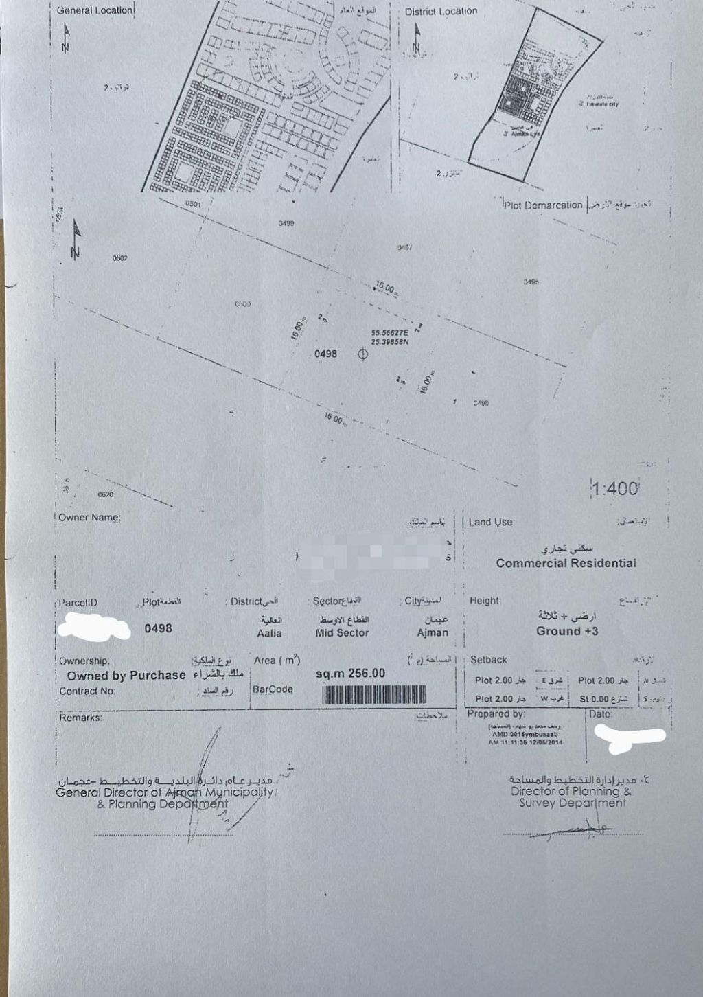Commercial land for sale in Ajman, Al Alia area, directly behind Tiger project. Area 256 SQM. Permit for ground floor + 3 floors. Price AED1125000 (final) Direct from owner