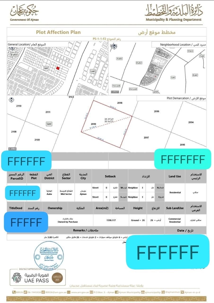 Prime Corner Residential Land for sale in Al Alia, Ajman for sale Premium Corner Plot Residential Land (with Commercial Sub - Use) in Al Alia - Ajman Key Details Area 13981.17 SQM (approximately 150500 SqFt) Building Permission Ground + 26 Floors ( G 26) Ideal for a high - rise mixed - use tower Price 6300000