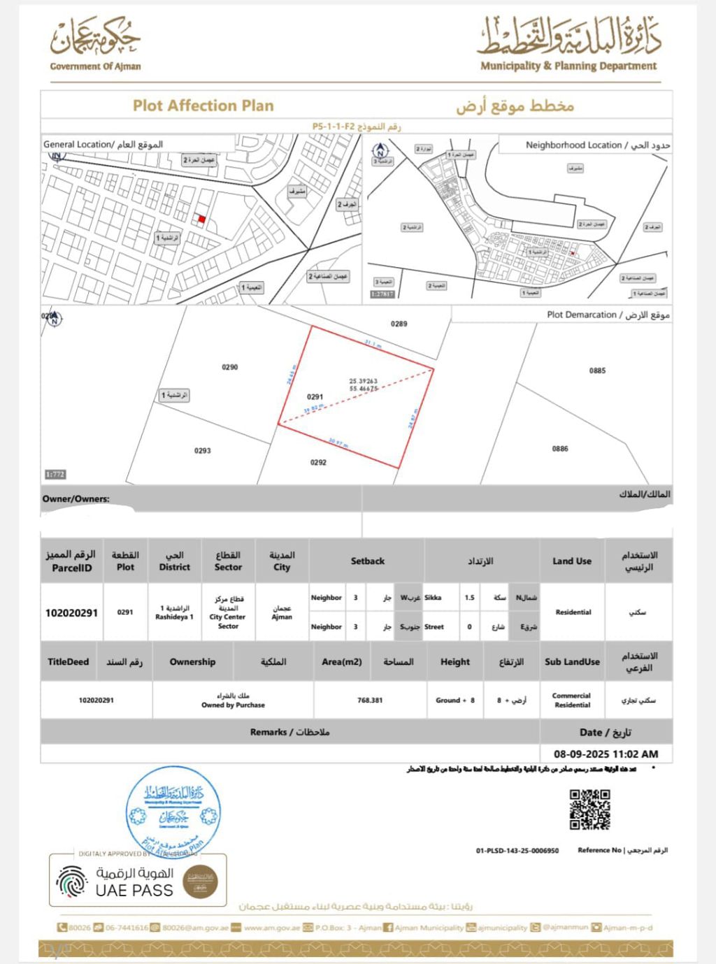 Residential & Commercial Land for sale - Rashidiya 1، Ajman Location Opposite Al Lulu Towers Plot Area 8266 SqFt Permission Ground + 8 Floors ( G 8) asking price AED6000000 اذا حاب أجهزة اعلان مختصر أو صيغة