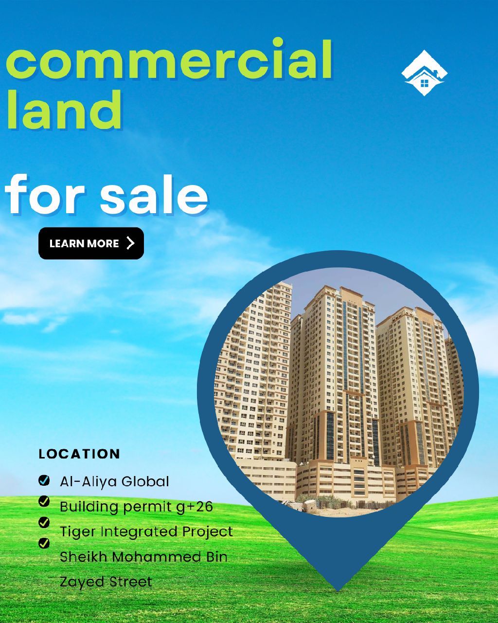 Commercial land for sale in Al - Aliya Global Permit Ground + 26 SQM On the main street Near the mosque Near the Tiger project Land area 17200 SqFt