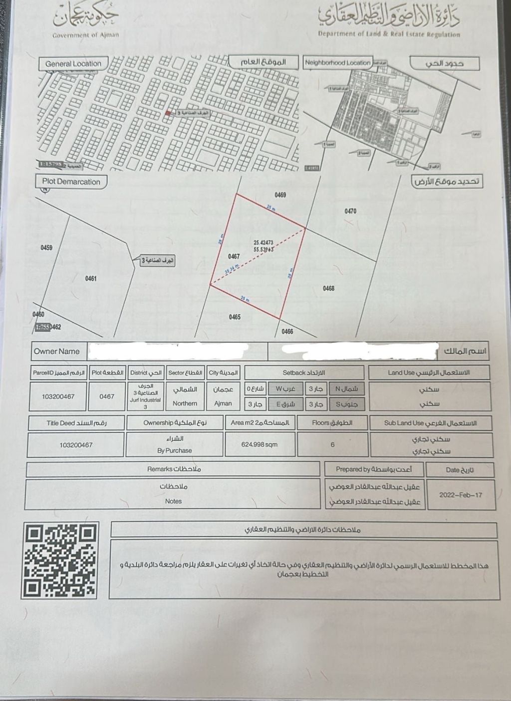 أرض لقطة للبيع تملك حر للبيع أرض سكني تجاري في الجرف الصناعية 3 تملك حر لجميع الجنسيات من داخل الدولة وخارجها تصريح سكني تجاري أرضي + 6 طوابق المساحة 625 متر مربع / 6727 قدم مربع السعر 2.3 مليون