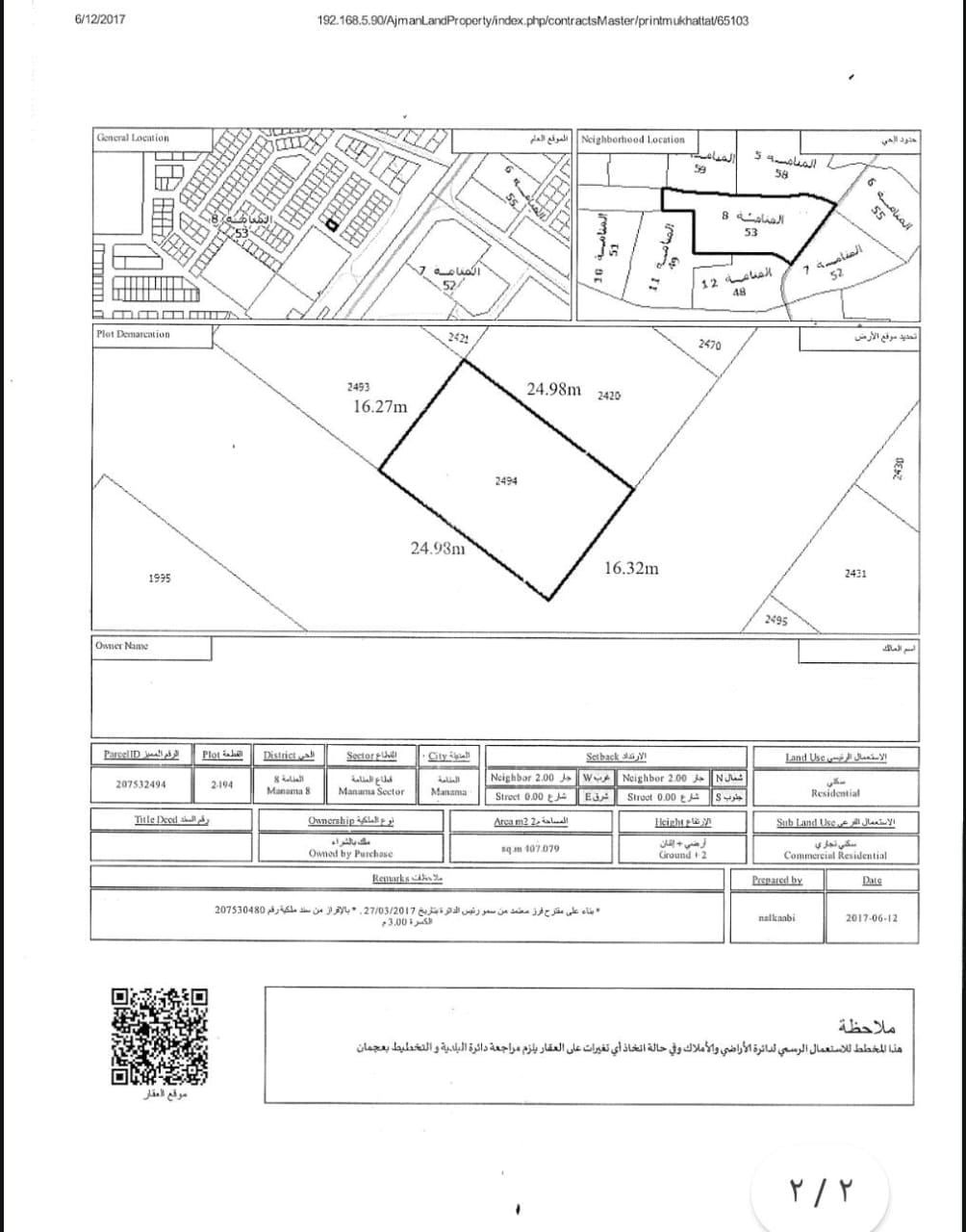 Direct from Owner - Rare Opportunity Location Al Manama, Basin 8 - Prime Location Number of Plots 2 adjacent Residential & Commercial plots Total Area 8600 SqFt. Corner Plot Frontage on three streets - very rare availability asking price AED660000 for both plots Serious buyers only - Negotiable call now WhatsApp/ Direct Call