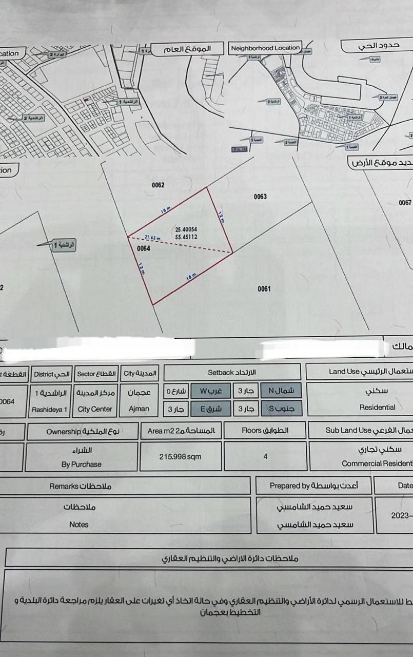 Direct from Owner - Land for sale Residential & Commercial Plot Location Rashidiya 1 Permission Ground + 4 Floors Area 215 SQM (approx. 2300 SqFt) Excellent Location asking price AED1200000 Great investment opportunity Contact