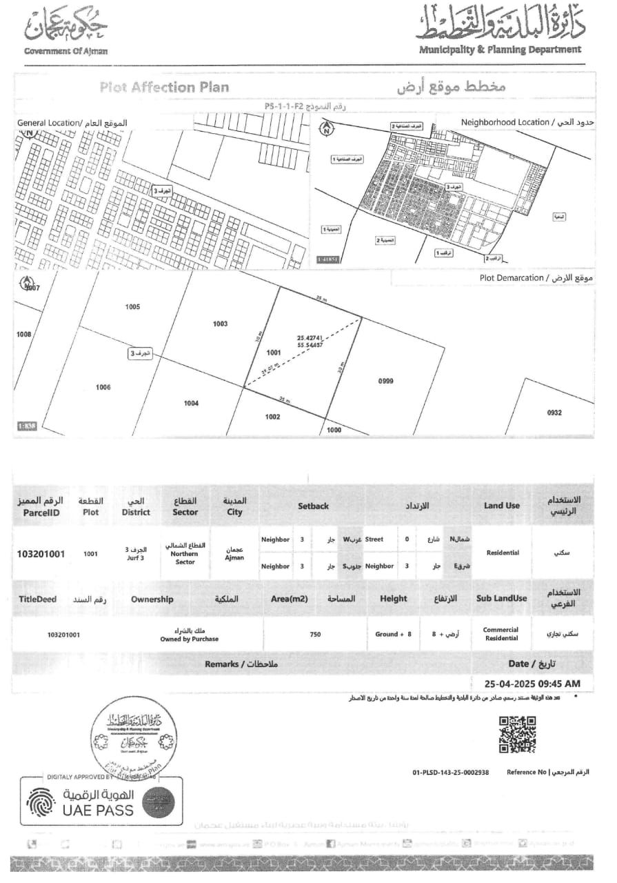 Direct from Owner - Land for sale Residential & Commercial Plot Location Al Jerf Industrial 3 Permission Ground + 8 Floors Area 750 SQM (approx. 8073 SqFt) Excellent Location asking price AED2200000 Contact