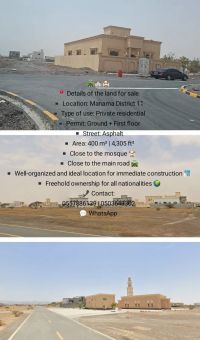 A valuable residential investment plot located in Al Manama 11, within a well - organized and growing neighborhood with increasing housing demand. The land comes with a Ground + 1 building permit, making it ideal for immediate construction of a private villa or a low - density residential project. Its proximity to key services and main roads enhances accessibility and long - term investment value