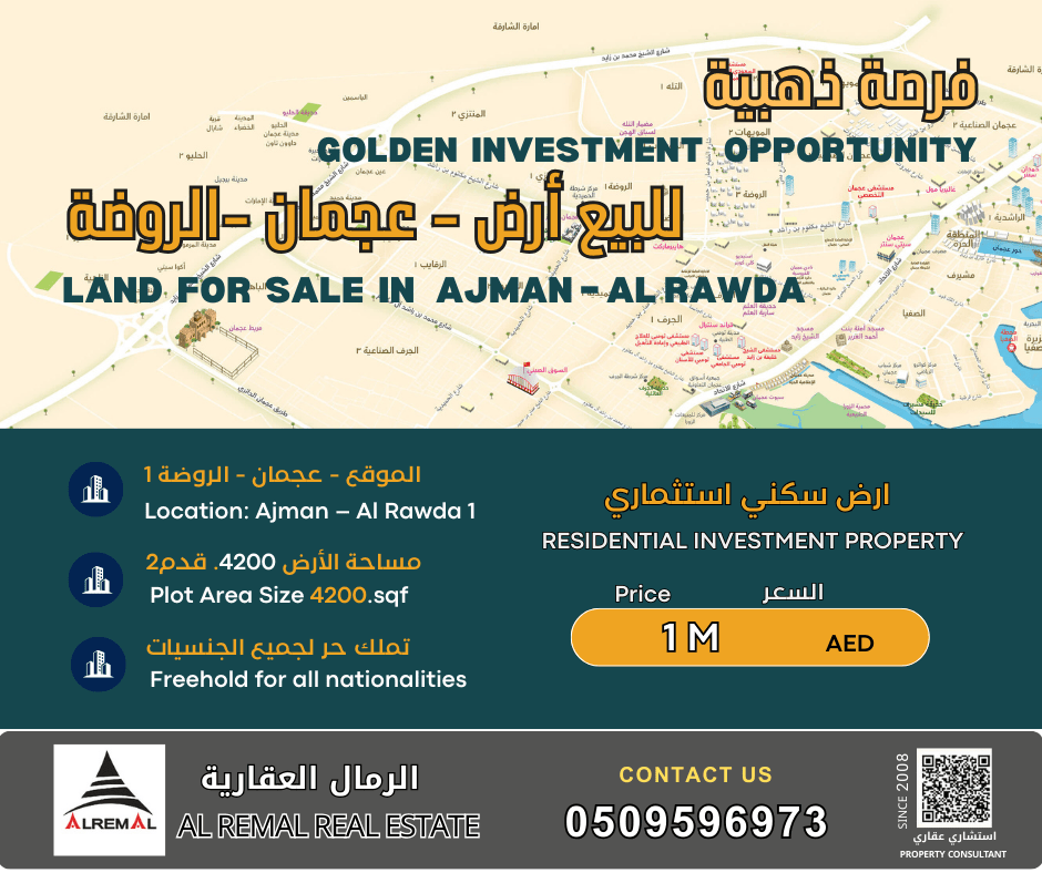 اعلان بيع قطعة أرض - عجمان فرصة ممتازة للتملك في موقع حيوي ومطلوب الموقع إمارة عجمان - القطاع الجنوبي المنطقة الروضة 1 مساحة الأرض 390 متر مربع الاستخدام سكني - مناسبة لبناء فيلا أرض بموقع مميز وقريبة من جميع الخدمات والطرق الرئيسية، خيار مثالي للسكن أو الاستثمار. السعر المطلوب 1000000 درهم للتواصل والاستفسار