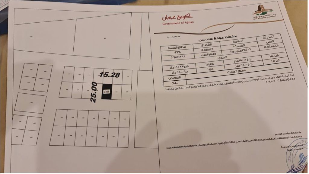 Land for sale in Al Manama area, Ajman, Block 1, residential plot. Area 382 SQM (4111 square feet) Freehold. Close to the main road. asking price AED182000 (excluding fees)