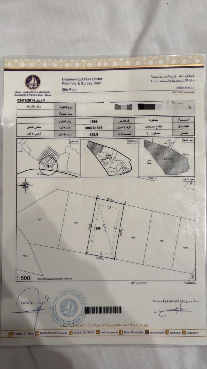 Land for sale in Ajman - Masfut Block 1 Plot Number 1899 Frontage On one street Land Area 435 SQM (equivalent to 4682 SqFt) Usage Private Residential Building Permission Ground + First Floor ( G 1) asking price AED180000 Location on Google Maps