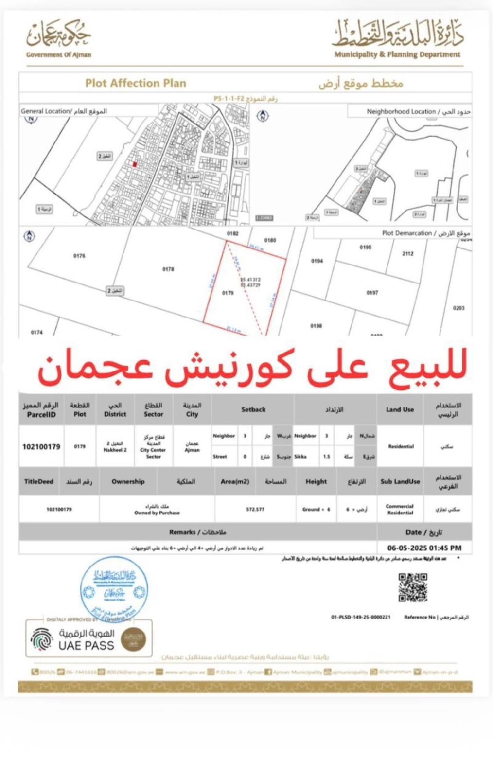 Land for sale at Corniche Ajman - Prime Investment Location Corniche, Ajman Land Details Area 6170 SqFt Building Permit Ground + 6 Floors ( G 6) asking price AED4850000For inquiries and viewing via WhatsApp Excellent opportunity to invest in a residential or commercial project in a strategic Corniche location