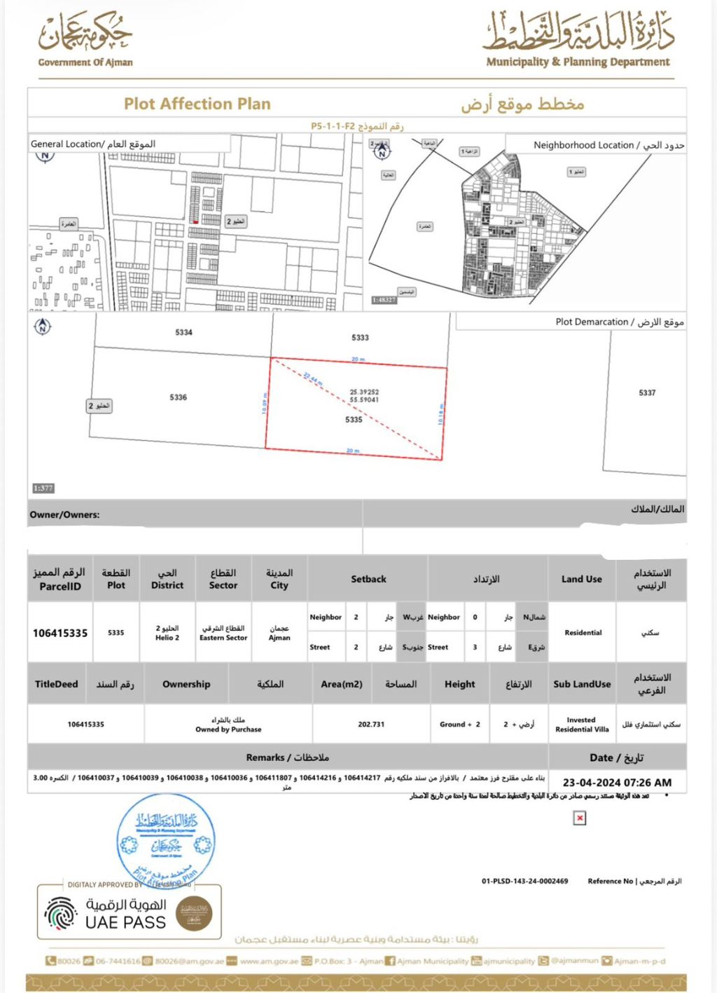 Location Al Helio 2 - Ajman Plot Size 203 SQM (2185 SqFt. Building Permit Ground Floor + 2 Floors Ownership Freehold for all nationalities Feature Corner plot on two streets asking price AED510000