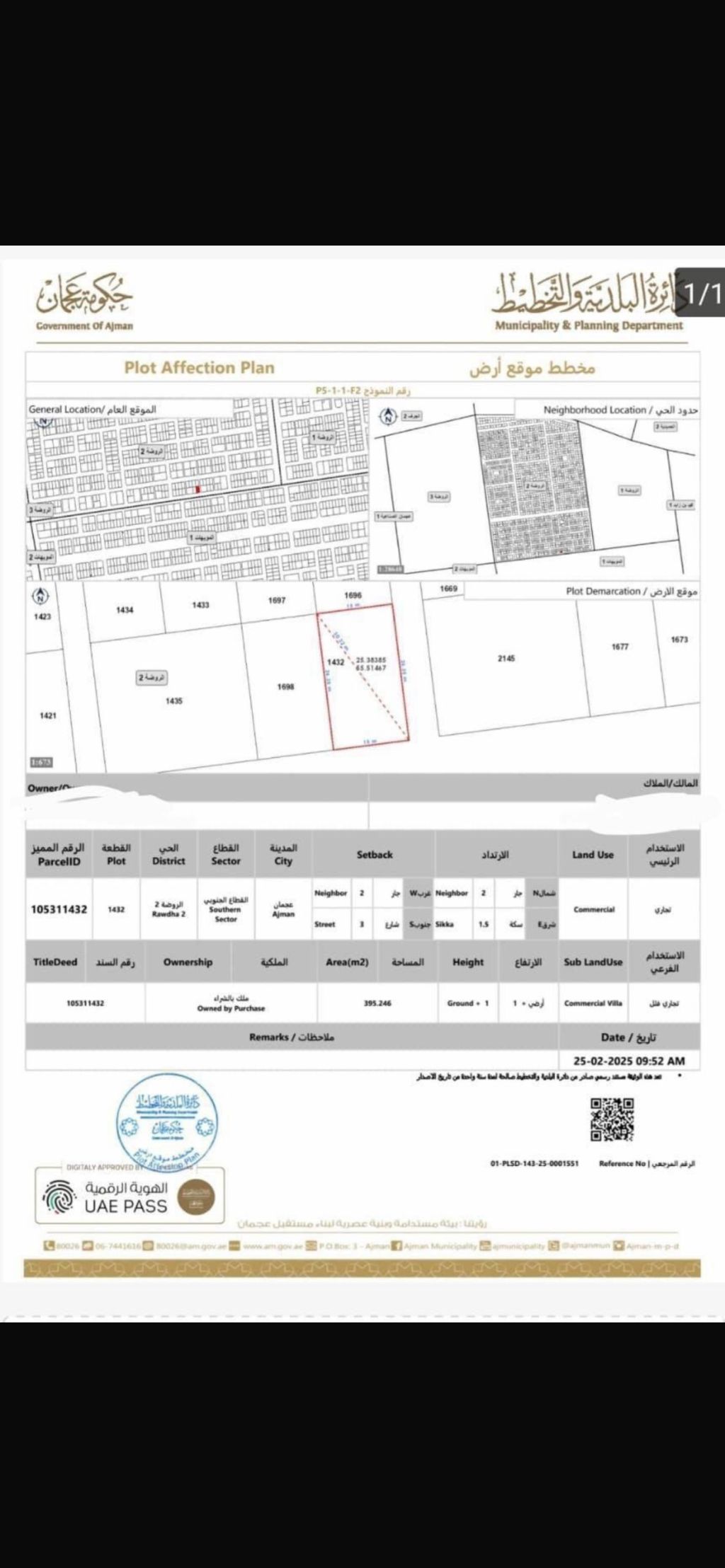 Residential/ commercial land for sale in Al Rawda 2, Ajman, suitable for villas. The plot is 4250 SqFt and has access to a street and alley. asking price AED1.3 million