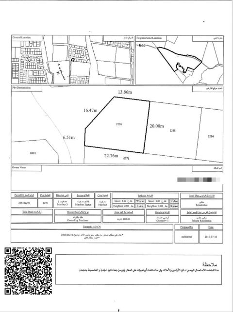 Land for sale with residential permit for a ground floor + 1 villa in Masfut, Block 3. Land area 4306 SqFt asking price AED180000 Contact