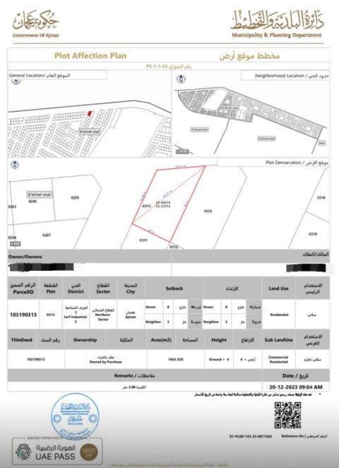 Residential land for sale in Al Tallah Gardens, next to the Saudi German Hospital and schools, and near the exit to Dubai and Sharjah. Land area 4065 SqFt. Freehold ownership for all nationalities