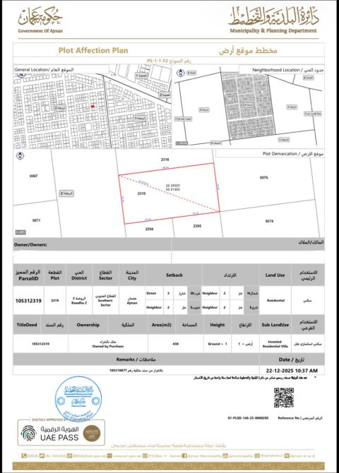 A Distinctive Investment Opportunity in Ajman - Residential Land for sale in Emirates City Are you looking for a promising real estate investment opportunity We offer a prime residential land plot in Emirates City - Ajman, located in an area experiencing rapid urban growth and increasing interest from investors and real estate developers. Land Details Area 2831 SqFt. approximately 260 SQM