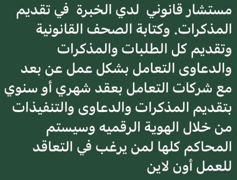 مستشار قانوني لدي الخبرة في تقديم المذكرات وكتابة الصحف القانونية وتقديم كل الطلبات والمذكرات والدعاوى التعامل بشكل عمل عن بعد مع شركات التعامل بعقد شهري أو سنوي بتقديم المذكرات والدعاوى والتنفيذات من خلال الهوية الرقميه وسيستم المحاكم كلها لمن يرغب في التعاقد للعمل أون لاين