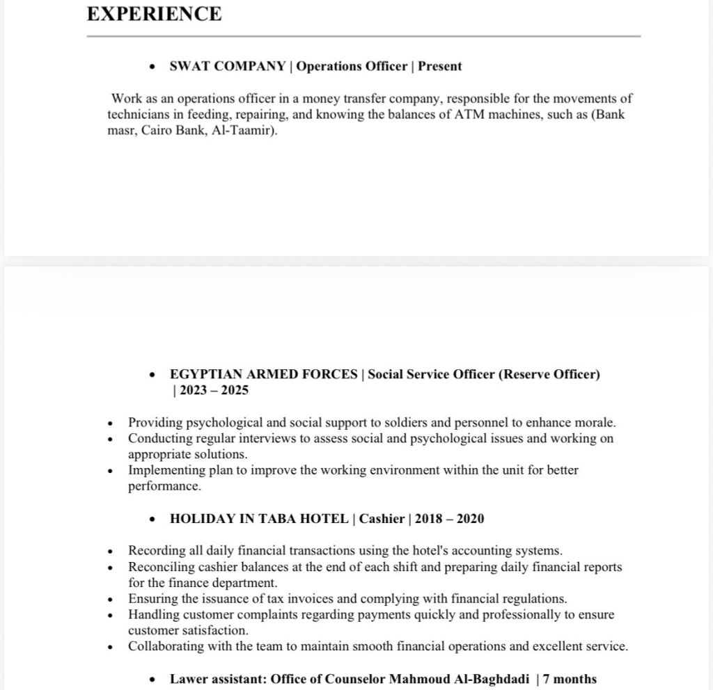 خبرة في الكشاير / مساعد عمليات في ماكينات ATM / التدريب في مكاتب المحاماة في مصر