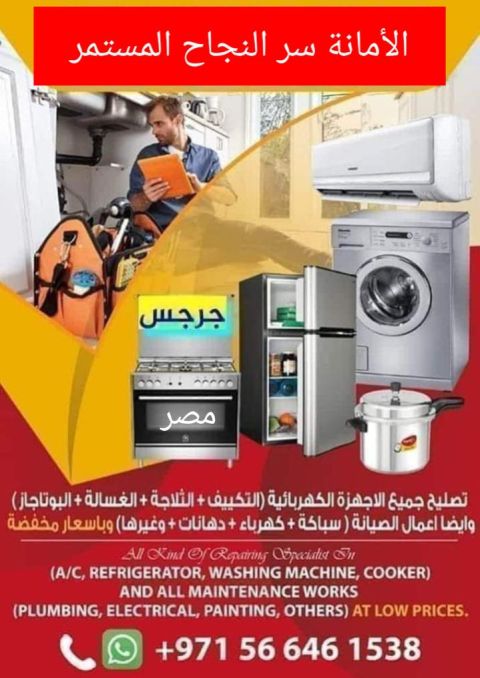 صيانة عامة الثلاجة والغسالة والبوتاجاز والميكروويف والأسبنسر والمكنسة والكبة والخلاط والمكواة (وجميع) الاجهزة الكهروبائية) وصيانة أفران الغاز الكبيرة (داخل المطاعم) وعمل صيانة كهرباء سباكة نقاشة نجارة وتركيب الستائر وتركيب حامل شاشات (التلفزيون) جرجس