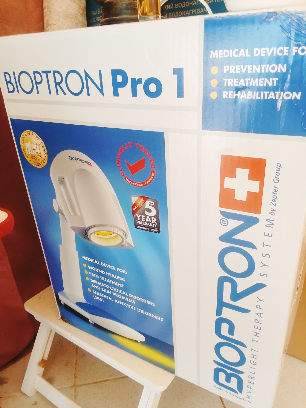 1 هذا جهاز BIOPTRON Pro 1 للعلاج بالضوء من مجموعة Zepter. الاستخدام جهاز طبي معتمد للوقاية والعلاج واعادة التأهيل. التطبيقات يستخدم لعلاج الجروح، وتسكين الآلام، ومشاكل الجلد، والاضطرابات العاطفية الموسمية (SAD) التقنية يصدر الجهاز ضوءا مشابها لضوء الشمس، ولكنه يخلو من الأشعة فوق البنفسجية الضارة