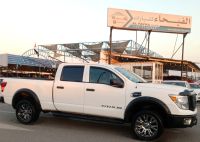 Nissan Titan XD 4x4 V8 5.6L 2017 model for 69,000 AED with 92,000 miles. American specifications, white exterior with gray/black interior. Features include: anti-lock brakes, air conditioning, airbags, aluminum wheels, AUX/Audio input, USB input, screen, Bluetooth, climate control, DVD player, fog lights, keyless entry, fabric seats, parking assist, central locking, power steering, power windows, and push-button start.
