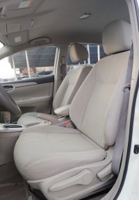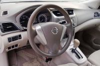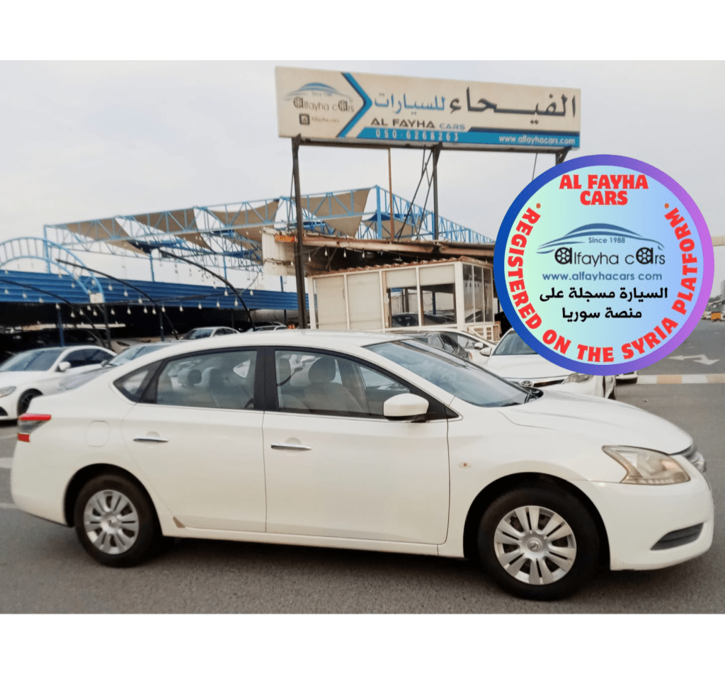 Nissan Sentra 2014 model. Price 22,000 AED. Odometer 156,000 km. Gulf specifications, black exterior, gray interior. Registered on Syria platform. Features include: audio controls on steering wheel, AUX input, CD player, cigarette lighter, computer showing distance, fuel, and average speed, keyless entry, manual AC, MP3, radio, temperature display, airbags, body-colored mirrors, electronic door mirrors, halogen headlights.