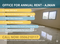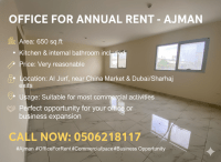 Office for Annual rent - Ajman Area 650 SqFt Kitchen & internal bathroom included Price Very reasonable Location Al Jerf, near China Market & Dubai/ Sharjah exits Usage Suitable for most commercial activities Perfect opportunity for your office or business expansion call now