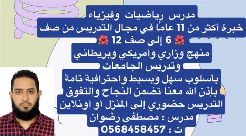 مدرس مصري خبرة داخل الدولة لتأسيس وتقوية الطلاب بجميع المواد الدراسية لجميع المراحل الدراسية للمناهج الحكومي الوزاري والأمريكي ومدارس الشراكة وتحفيظ القرآن الكريم شرح مبسط ومتابعه مستمرة وحل الواجبات والعمل علي جميع المنصات التعليميه حضوري في البيت