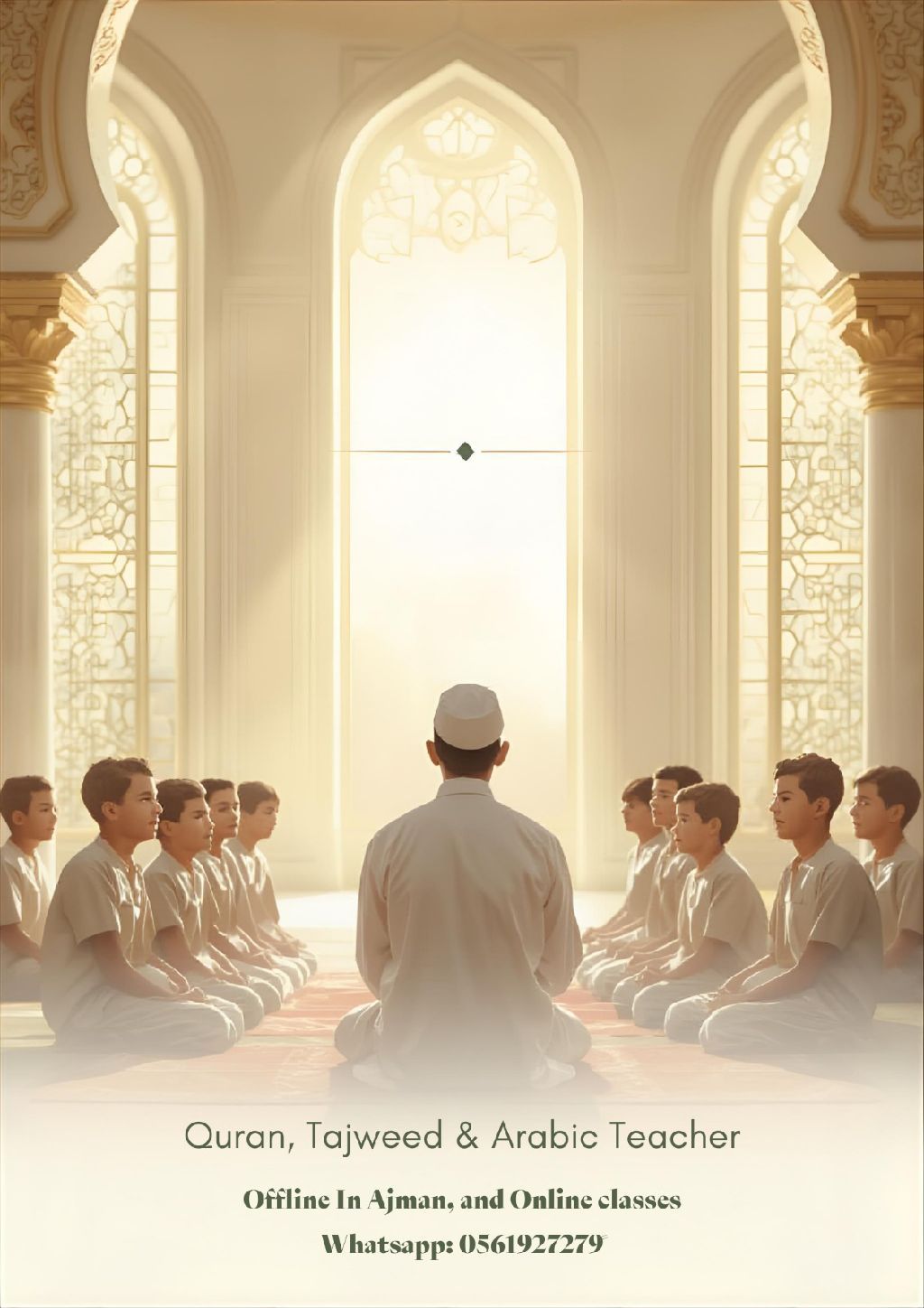 بدون مقابل يمكنني مساعدتك في تعلم القرآن وتجويده اونلاين بشرط أن تكون جادا ملتزما بالموعد، صابرا على التعلم، أنا مجاز برواية حفص عن عاصم وأحب أن أساعدك في ضبط تلاوتك للقرآن، متاح فقط لشخص أو اثنين على الأكثر