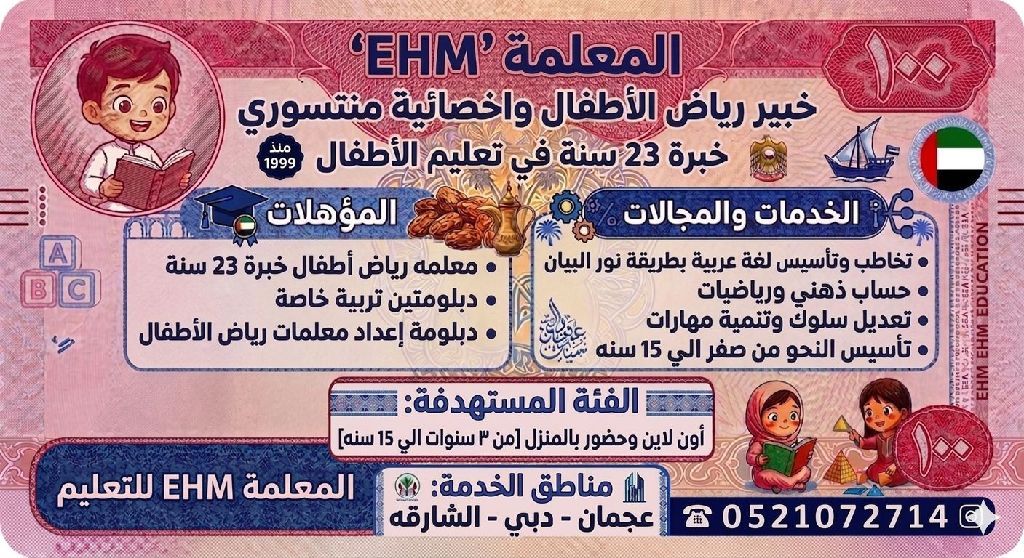 معلمه رياض اطفال تأسيس لغة عربية بطريقة نور البيان ورياضيات من 3 سنوات حتى 15 سنة وتخاطب وتعديل سلوك وحساب ذهني وصعوبات تعلم