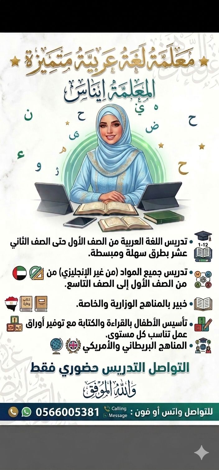 Experienced university - educated teacher, currently in Ajman, offers private tutoring for students from grades 1 to 6 (primary) in mathematics, Arabic language, Islamic studies, and social studies. Simplified explanations and homework assistance are provided. Individual or small group lessons are available at reasonable rates. Location Ajman. Contact