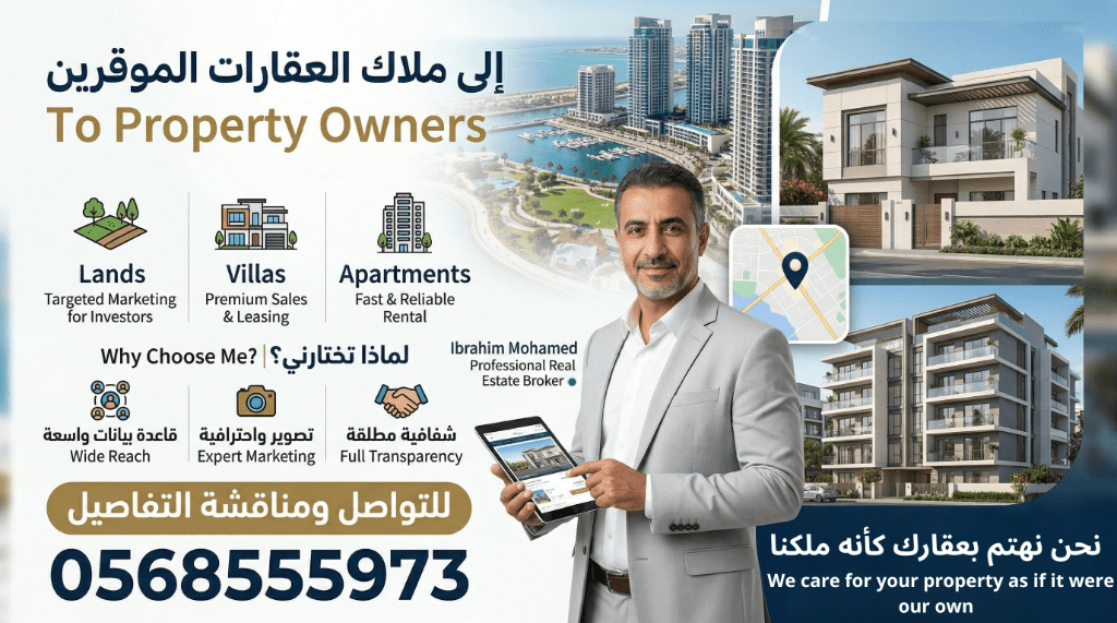 الى ملاك العقارات الموقرين سوق عقارك باحترافية هل تملك (أرض، فيلا، أو شقة) وترغب في بيعها أو تأجيرها بسرعة بصفتي وسيط عقاري خبير، أقدم لكم خدمات تسويقية مبتكرة لضمان الوصول لأفضل العملاء والجادين فقط. التزام تام بالشفافية، وسرعة في الانجاز، وتغطية واسعة لكافة المنصات. دعنا نحول عقارك الى صفقة ناجحة اليوم. للتواصل مباشرة نحن نهتم بعقارك كأنه ملكنا