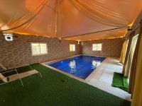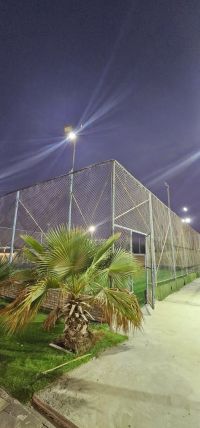 A farm for daily rent in Ajman, Al Helio area. It has 2 villas, a swimming pool for adults, a children’ pool with water games, a paddle court, a football field, a fish lake, and outdoor seating. Daily rent is 2500 on weekends and 1500 on weekdays