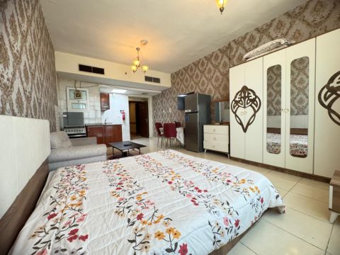 For monthly rent in Ajman, Al Bustan area, Orient Towers a fully furnished studio apartment. The furniture is clean and tidy, offering a luxurious and elegant living experience. It features a spacious layout, central air conditioning, a semi - separate kitchen, and a bathroom. The tower is very clean and located on Al Mina Street, opposite the fish market. The area is very vibrant and offers all se